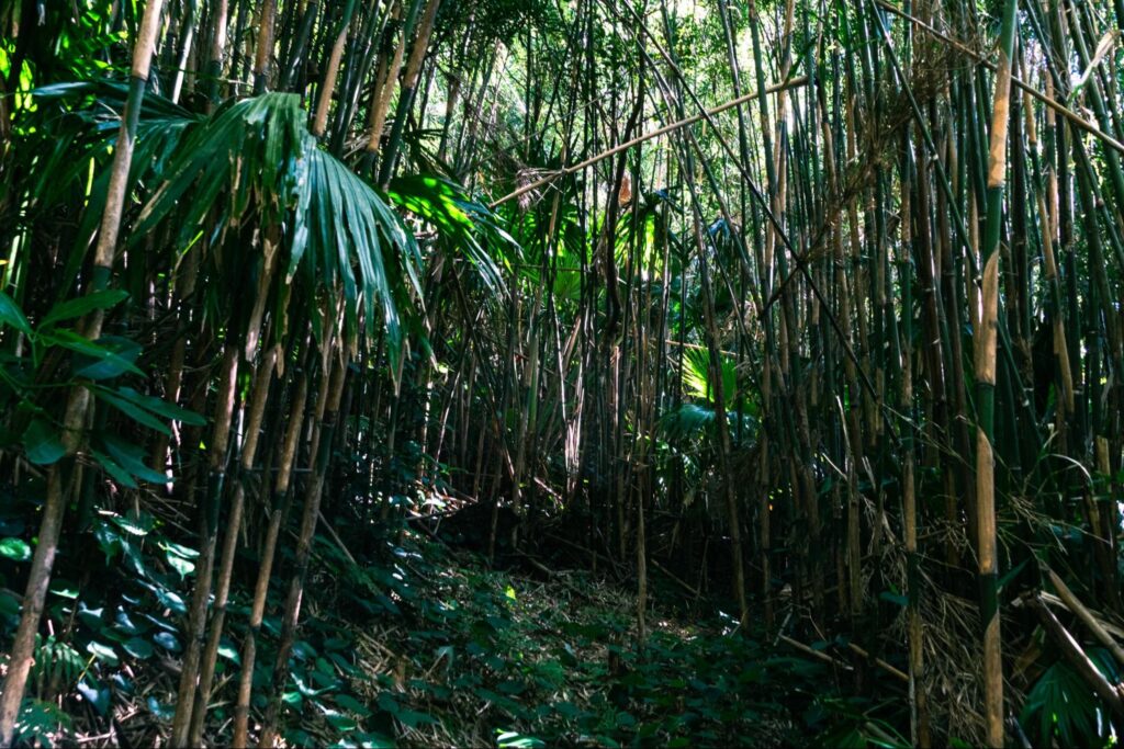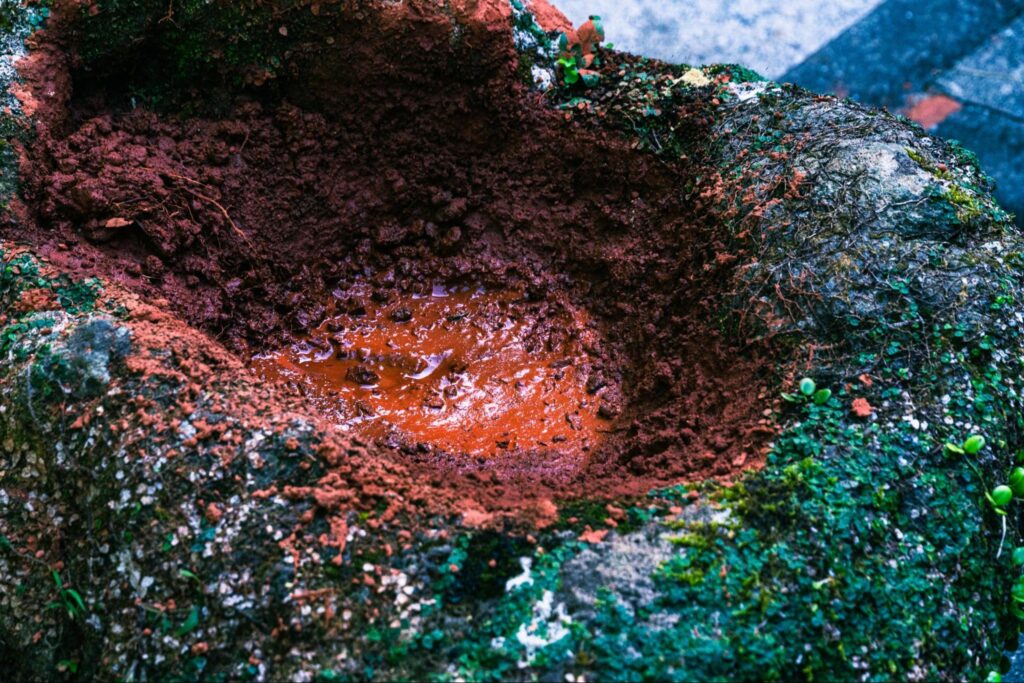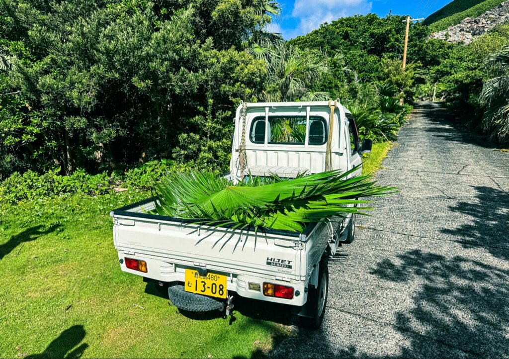 「テラ」で誕生したボゼは一面に赤シュイを塗り、ビロウの葉を纏う。島のことばではビロウを「クバ」「コバ」という。クバは沖縄や奄美でウタキ(御嶽)とよぶ拝所において、常緑の神木として植えられる神聖な植物である。悪石島のいたるところにも墓所があり、ビロウの森のなかにぽっかりとひらけた空間がそれである。御嶽を思わせるその空間には、神木のようにしてビロウが茂る。