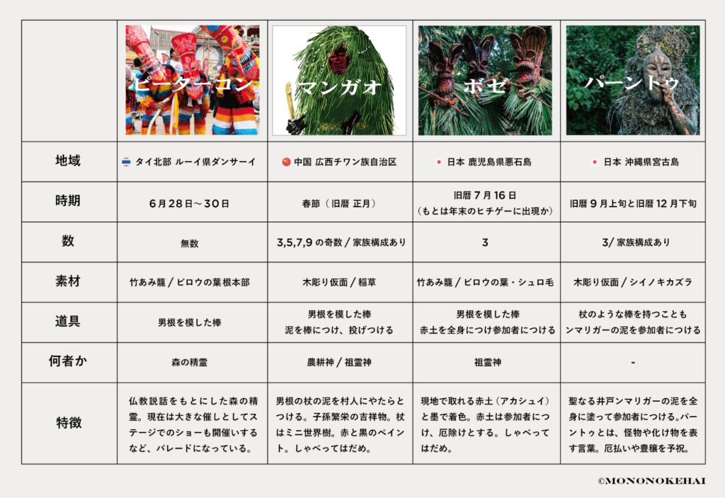 マンガオを仮面来訪神アーキタイプと考えてみると、タイ北部で仏教と混ざり独自に発展し、海を渡って分岐したものは、日本やメラネシアを含むオセアニアにそれぞれやってきて独自の進化を遂げたと考えられるのではないだろうか。マンガオの形質は、パーントゥやアカマタ・クロマタ、ボゼやメンドンにそれぞれ受け継がれているように思う。