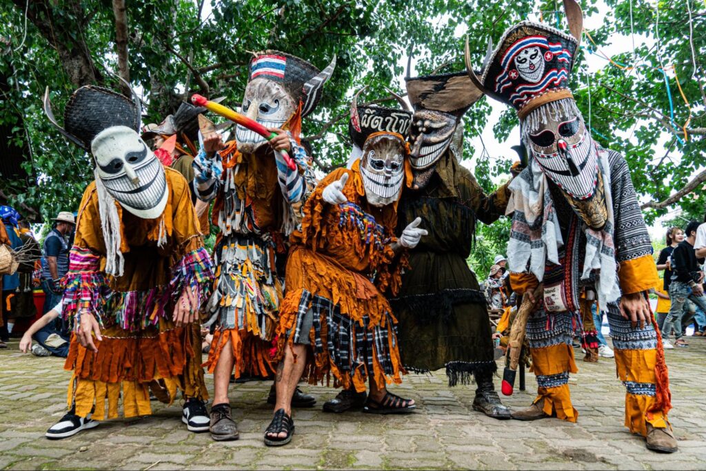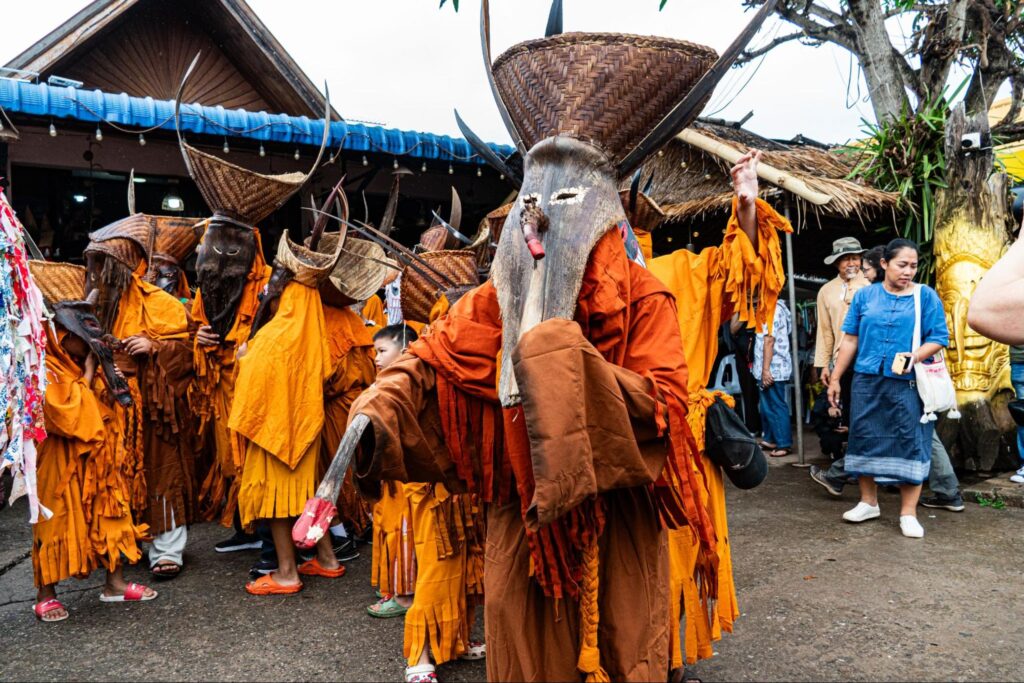 竹であんだ籠を頂く来訪神をタイで見てきた。仏教の説話が由来となったピーターコン祭りの森の精霊たちだ。