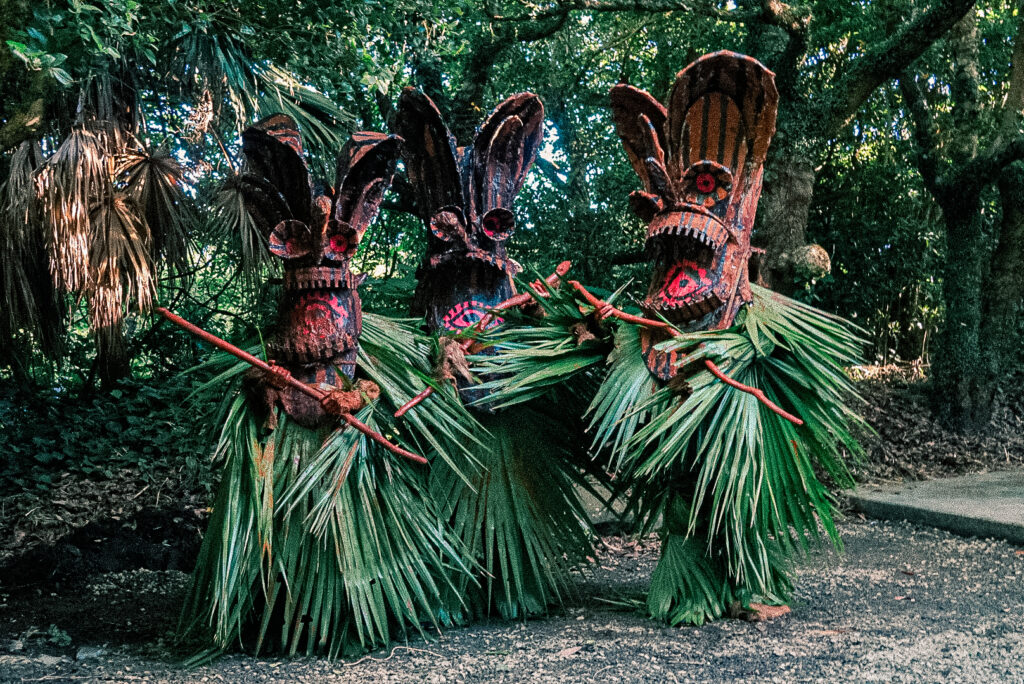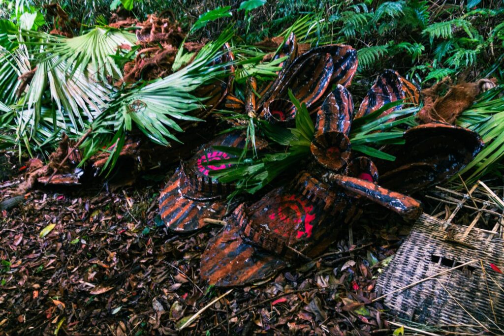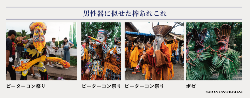彼らはビロウの茎を仮面としていることに加え、頭には竹の籠を被る仮面神だ。共有点は他にもある。彼らは皆、男性器を模した棒を様々な形に変えてその手に持っている。