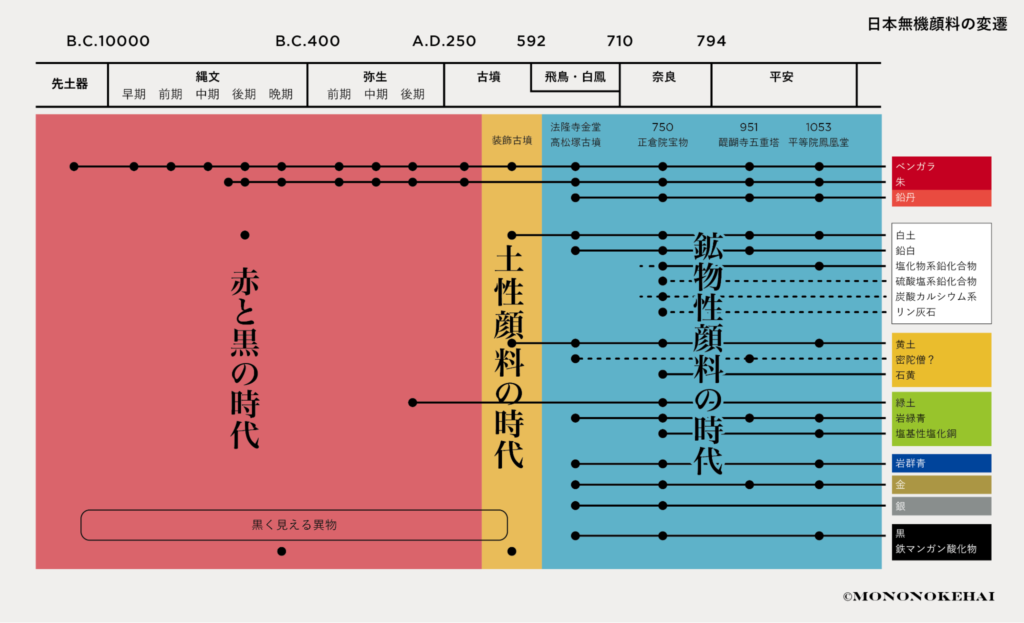 元宮内庁正倉院事務所で文化財保存修復研究センター長の成瀬正和は装飾古墳の色料についてのレポートで、古墳時代初期以前のことを「赤と黒の時代」とした。