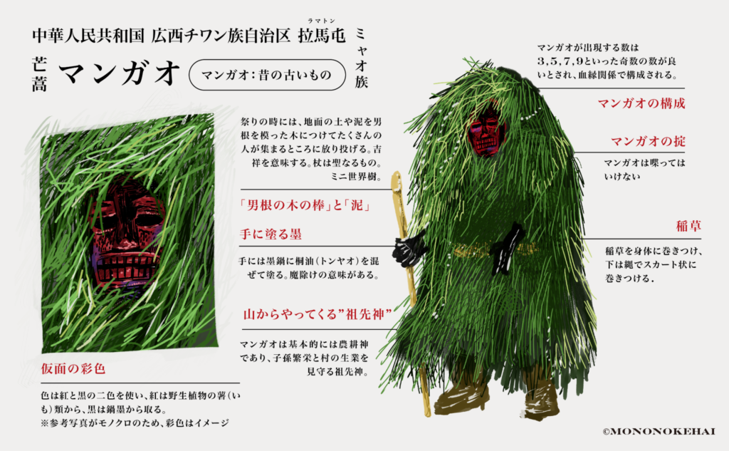 ではボゼはどこから来たのか。わたしにはマンガオがそのアーキタイプなのではないかと思えてくる。『稲と鳥と太陽の道』では、日本のコメはミャオ族によってもたらされたという仮説が紹介されている。コメとともに運ばれた精神文化のひとつとして、年はじめに草で身を包んで出現する来訪神を挙げる。