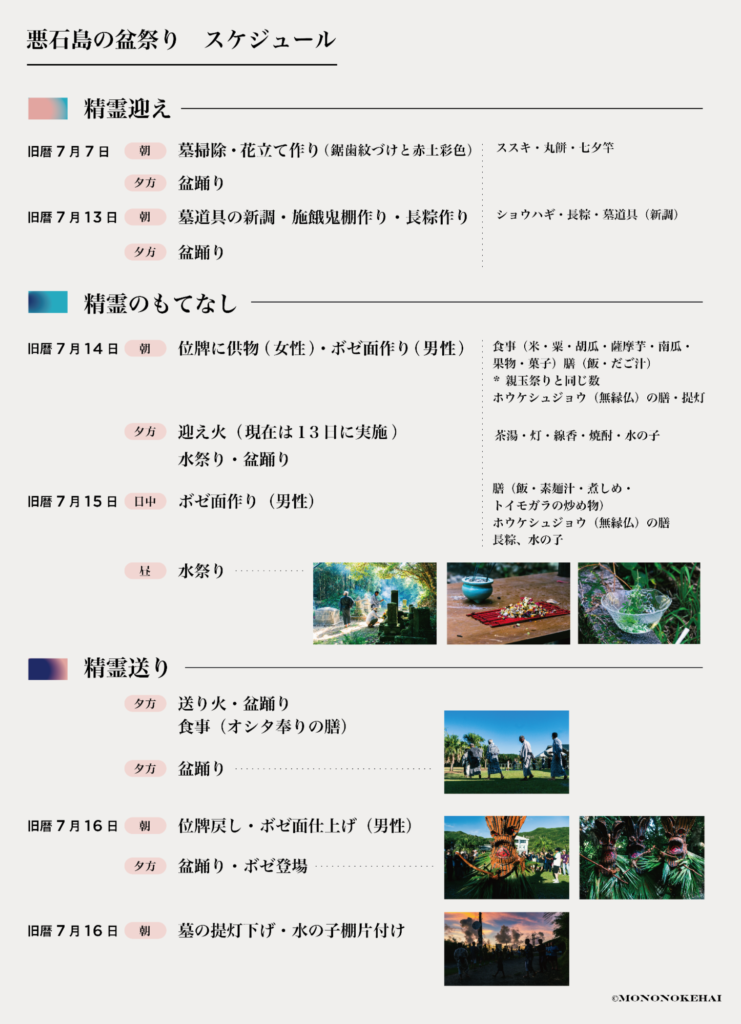 暦法発達以前の農耕民は生産歴をとるのが普通であり、古代の年はじめとは収穫祭の時期にあたり、祖霊来訪の節目でもあった。そして大抵は強い物忌を強いる。このことは、向山が指摘したように、ヒチゲーが一年の節日であったこと、強い物忌を要請したこと、ボゼに祖霊神的性格をみたことにも通じる。
