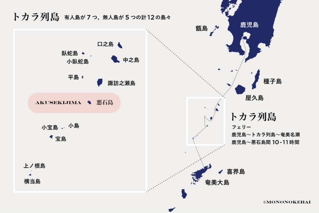 ボゼは過去には他の島でも現れたというが、今では悪石島のみに現れる来訪神だ。悪石島へは鹿児島港からフェリーで10時間程度かかる。週に2本のみの就航で、その際にそれぞれの島への物資や必需品もともに運ばれる。
